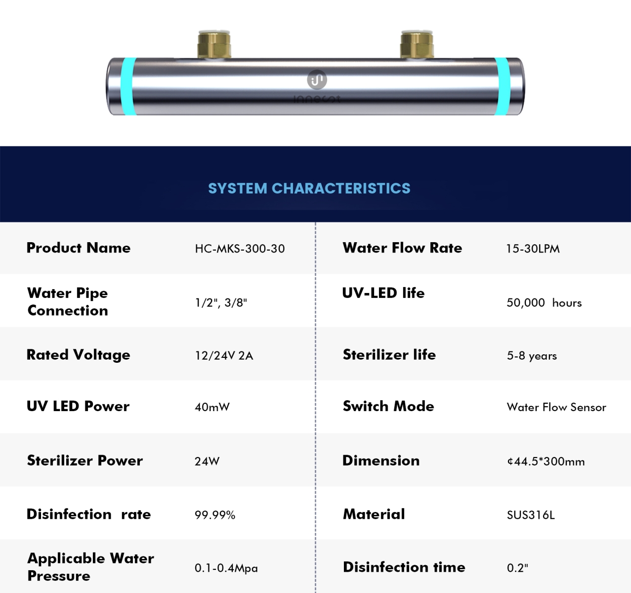 INNEST UV Flowing Water Sterilizer utilizes ultraviolet (UV) light to kill or deactivate bacteria, viruses, and other microorganisms present in water. The device is typically installed in a water pipeline or carried in a handheld device, and water is passed through it. The UV light from the device deactivates the microorganisms present in the water, making the water safe for use for drinking and other purposes. It is an effective and chemical-free way of sterilizing water and is commonly used in residential, commercial, and industrial settings.