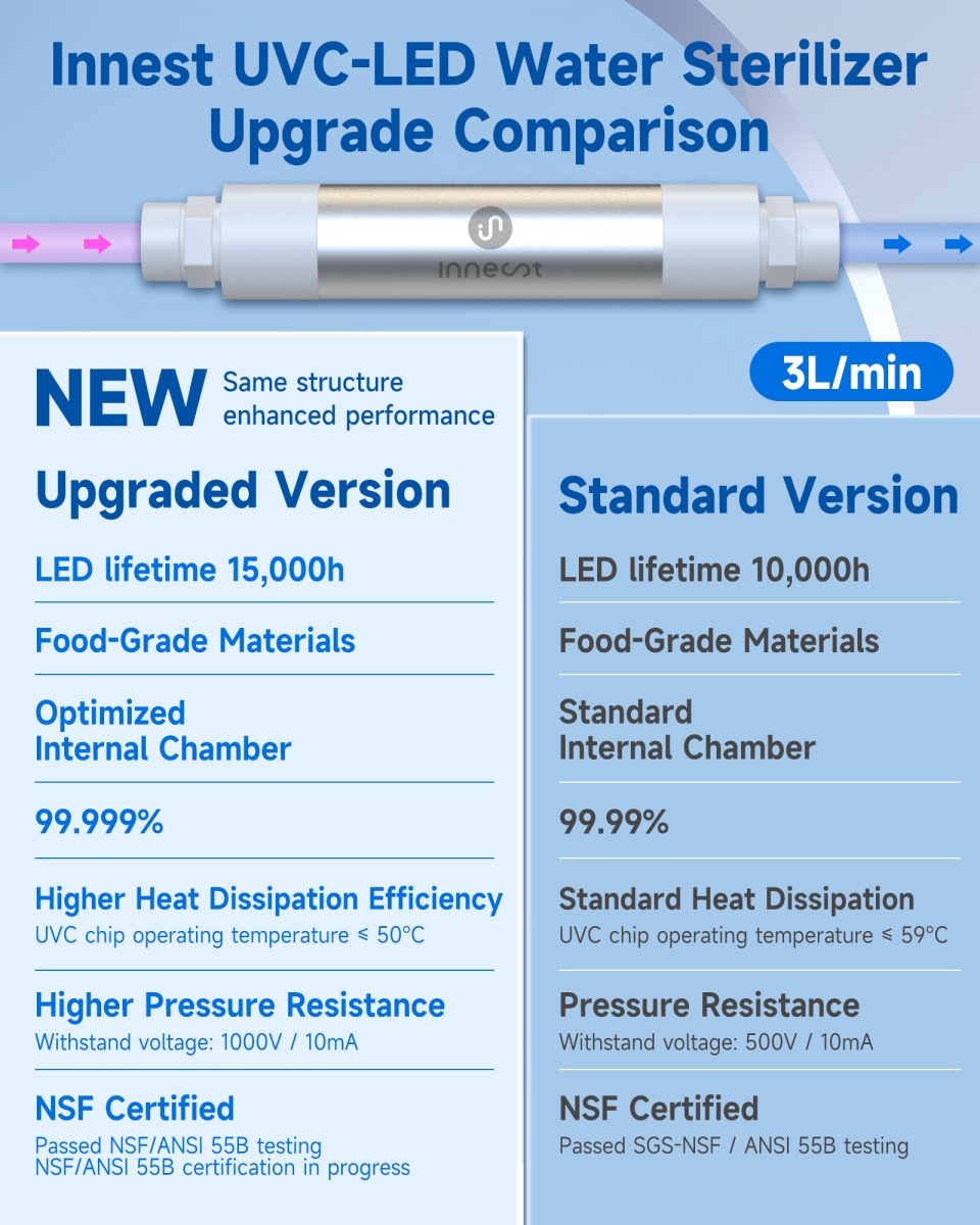 In sterilization performance, the upgraded units feature enhanced optical design and optimized water-flow pathways, allowing UVC-LED energy to be utilized more efficiently. This enables faster, more stable, and consistently high sterilization performance, providing stronger protection for everyday household water use.