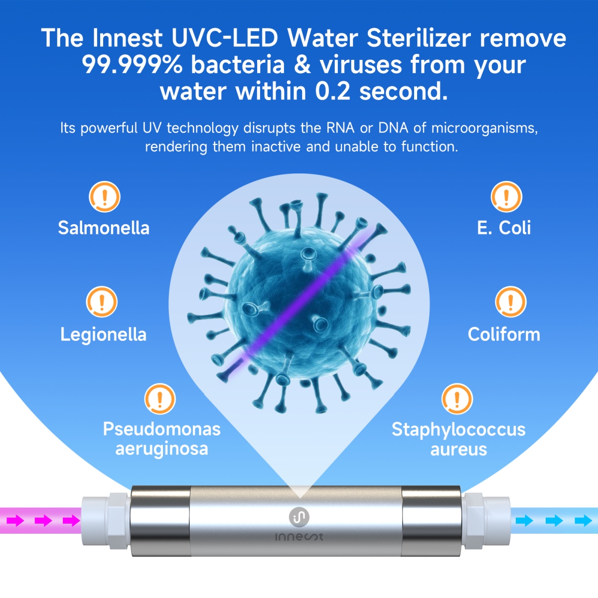 近年、世界的に水の安全性への関心が高まる中、Innestは家庭用から業務用まで、多様な水処理ニーズに応える信頼性の高いソリューションを提供しています。当社のUVC-LED水殺菌技術は、45 mJ/cm² の正確な紫外線照射量を実現し、さまざまな微生物に対して高い殺菌効果を発揮します。
