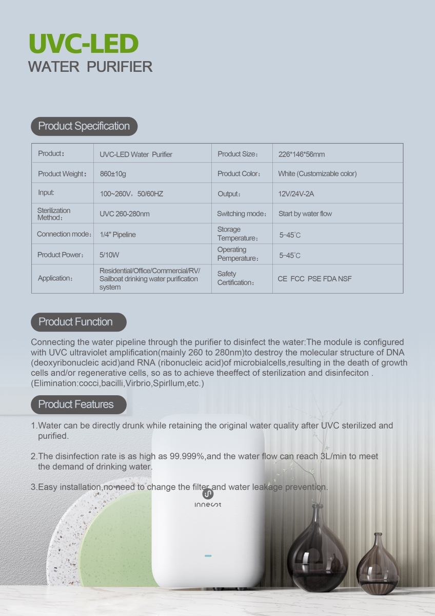 Connecting the water pipe through the water purification box to disinfecting the water:The module is configured with UVC ultraviolet amplification (mainly 260 to 280nm)to destroy the molecular structure of DNA (deoxyribonucleic acid) and RNA (ribonucleic acid)of microbial cells,resulting in the death of growth cells and/or regenerative cells, so as to achieve the effect of sterilization and disinfeciton .(Elimination:cocci,bacilli,Virbrio,Spirllum,etc.)